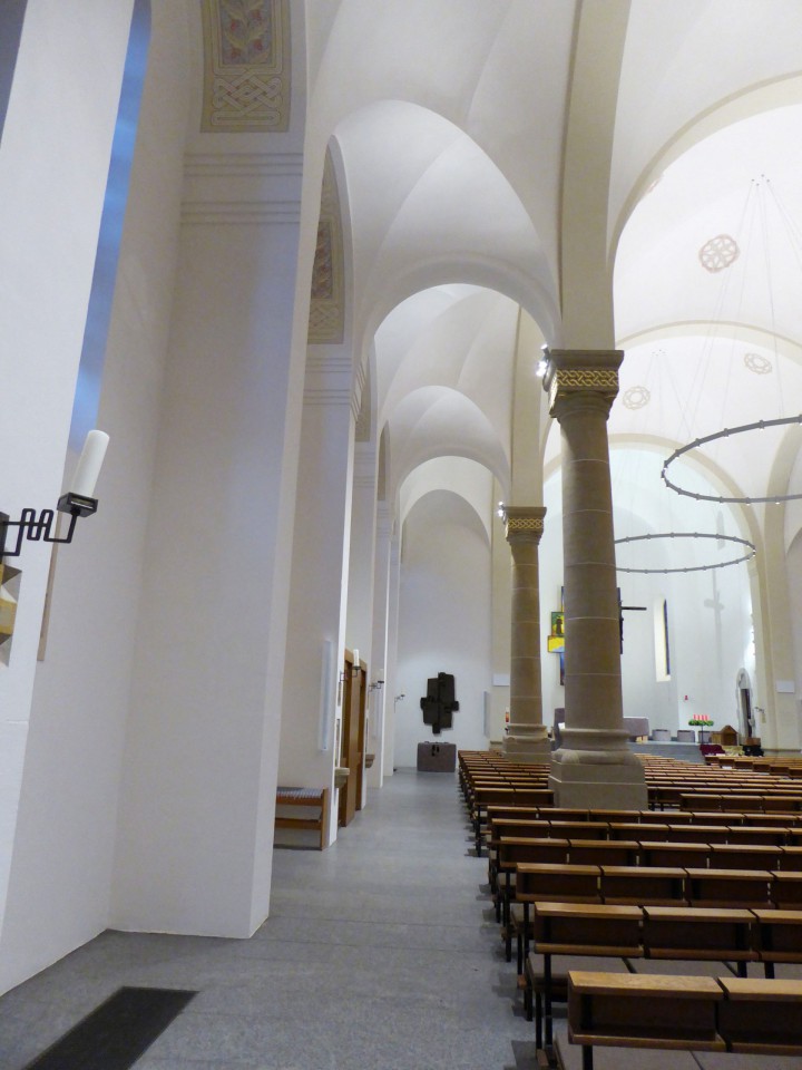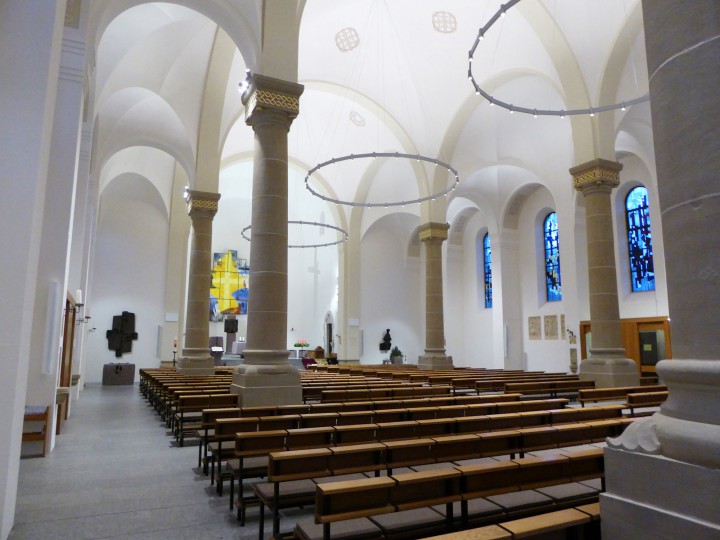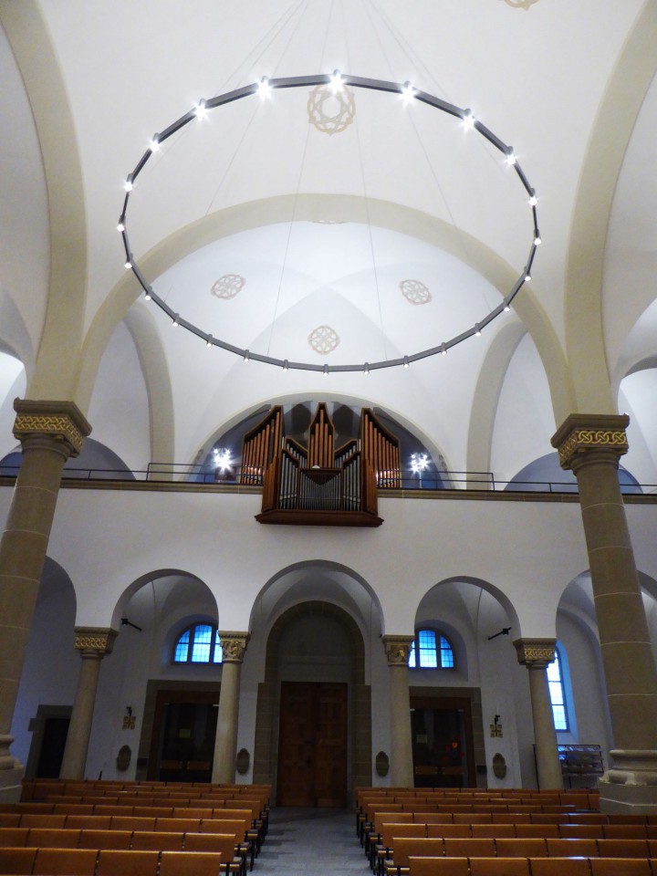 Dieses Kirchenprojekt umfasste eine Vielzahl unterschiedlicher Sonderleuchten, die von uns hergestellt wurden. Aluminiumgussteile, Frästeile und Standardprofile wurden hierfür be- und verarbeitet, um Stehleuchten, Wand-, Kapitell- und sogar Zugankerleuchten herzustellen. Am beeindruckendsten sind aber sicherlich die drei 5m grossen Ringleuchten im Mittelschiff der Kirche Herz Jesu. Je 24 Down- und 24 Uplights sind hier integriert und können mit einem Dalisystem individuell gesteuert werden.