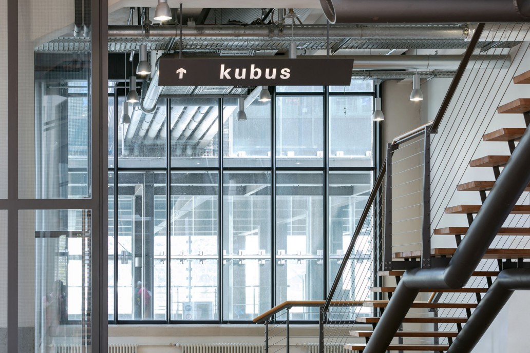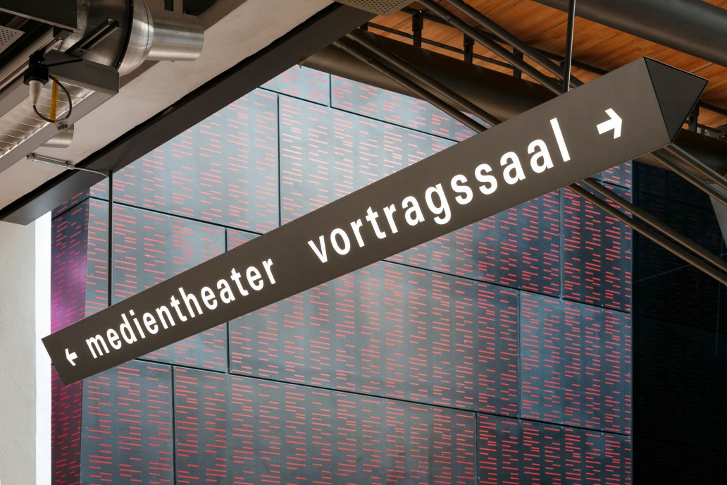 Für das weltberühmte ZKM in Karlsruhe entwickelte Syma gemeinsam mit Fabian Maier das Leitsystem. Dreieckige Korpi mit ausgelaserten Schriftzügen die mit satinierten Acrylplatten hinterlegt und durch Led stripes beleuchtet werden ermöglichen eine einfache Orientierung in der ehemaligen Munitionsfabrik. Da die Seitenflächen der Wegweiser im 30° Winkel zur Vertikalachse stehen sind sie sowohl aus der Ferne als auch aus der Nähe gut lesbar. Auf der Oberseite sind die Abpendelelemente angebracht, ausserdem Revisionsklappen und Potentiometer für eine manuelle Lichtstärkenregelung. Die Oberflächen wurden in DB 703 pulverbeschichtet.